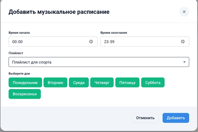 Перейдите на вкладку «Музыка», чтобы открыть музыкальное расписание и кликните на кнопку "+ Добавить расписание". Откроется форма создания расписания.