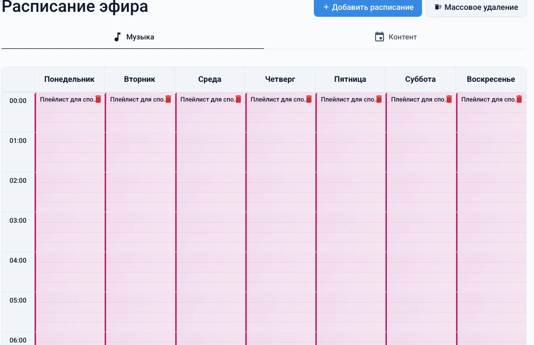 Нажмите «Добавить» для сохранения расписания. Новый блок появится в таблице музыкального расписания.