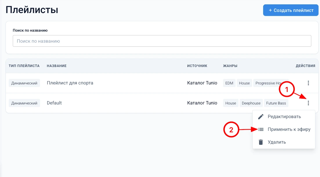 - Выберите эфир в котором нужно применить плейлист