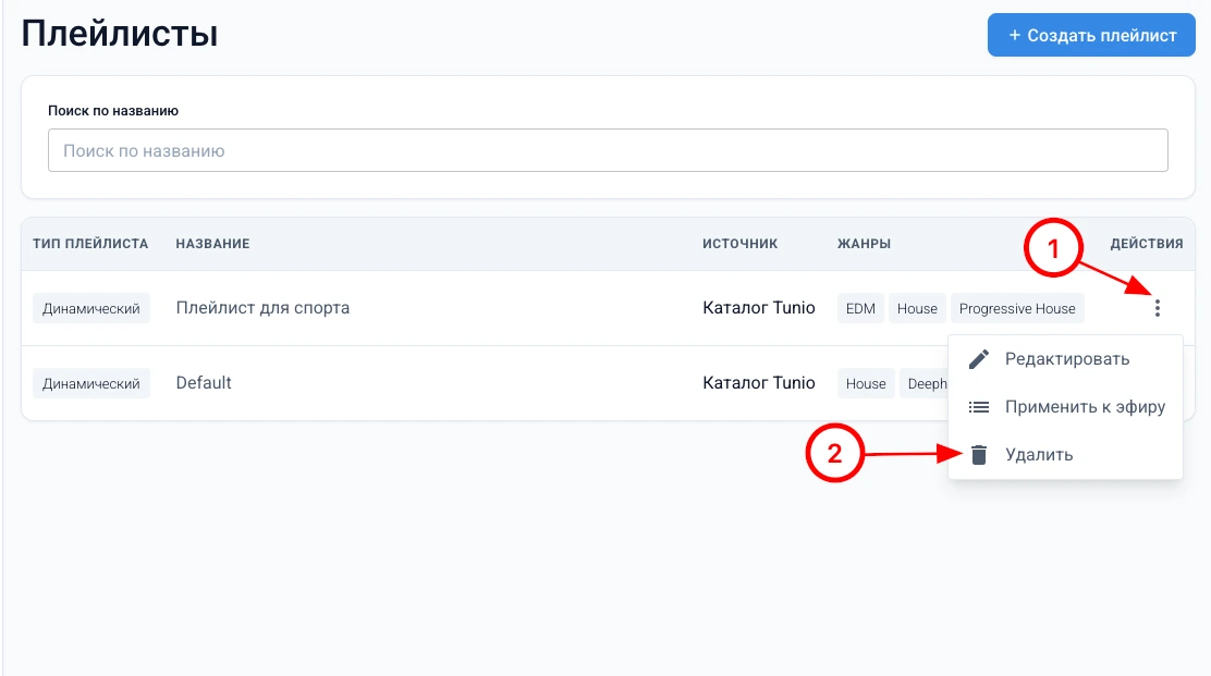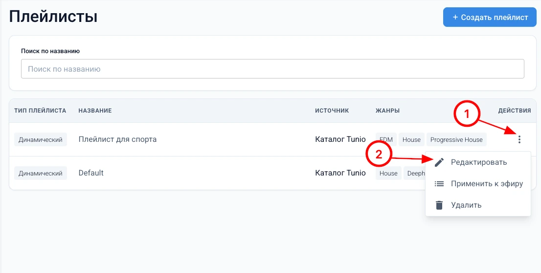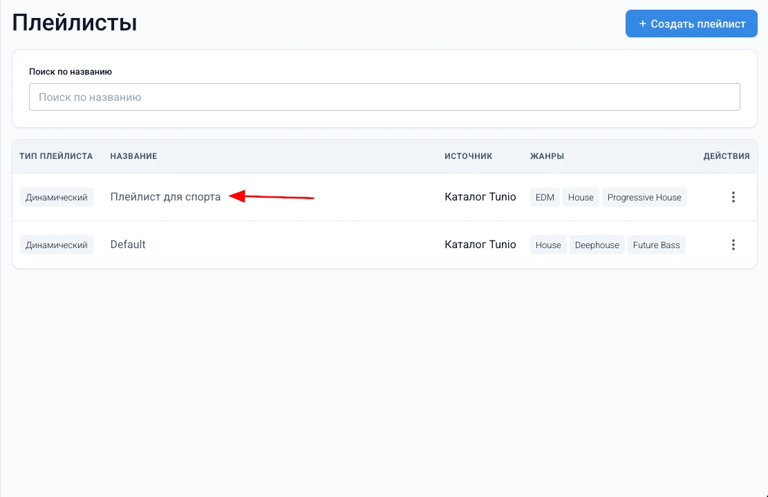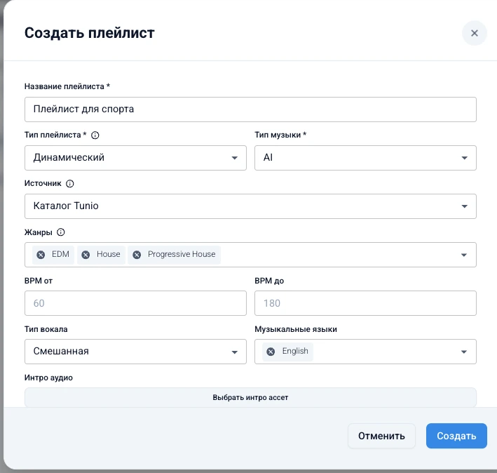 В этом разделе вы узнаете, как создать новый плейлист в личном кабинете Tunio. Плейлист позволяет автоматически формировать музыкальный поток на основе выбранных параметров: жанров, BPM, вокала, источника и других настроек.
