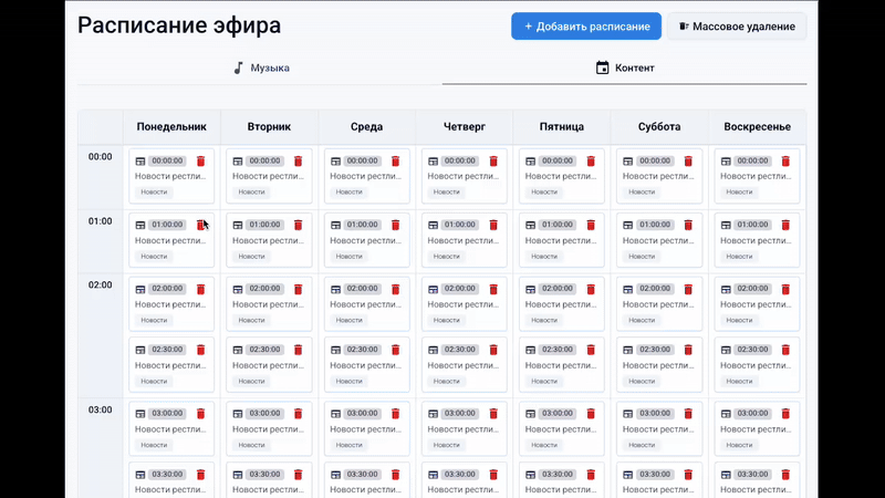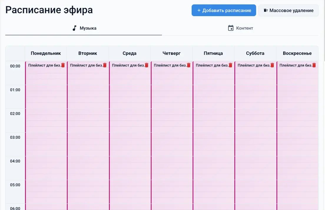 Функция «Расписание эфира» позволяет задать, какая музыка или контент будет звучать в определённое время суток на вашей станции. Это основной инструмент автоматизации эфира: вы можете заранее распределить плейлисты, джинглы, подкасты и другие блоки по дням недели и часу.