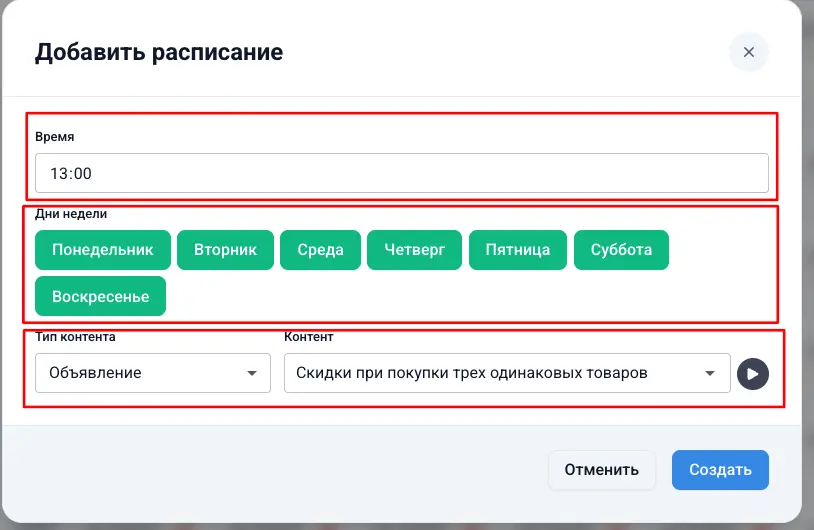 - Тип контента - Новости, Подкаст, Объявление или Погода